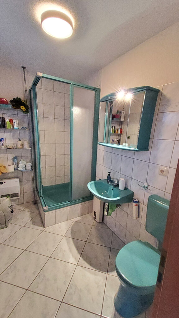 Das Bad kann elektrisch beheizt werden. Eine kleine ausklappbare Trockenspinne befindet sich unterhalb des Fensters.