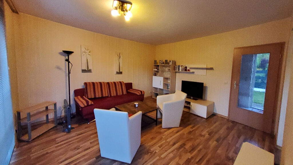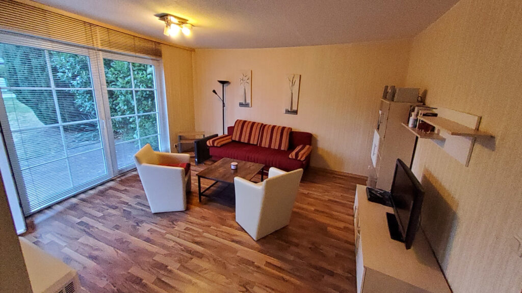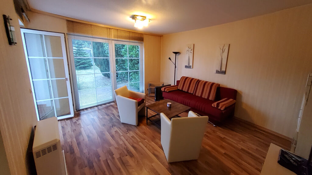 Das Wohnzimmer ist etwa 19 qm groß und verfügt über ein Schlafsofa.
